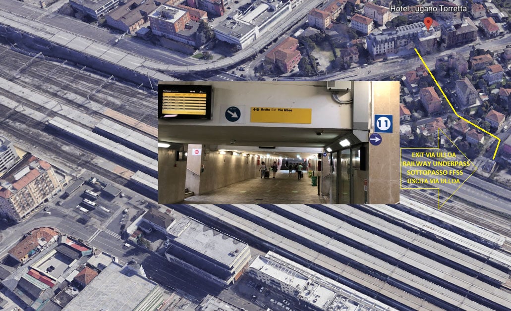 - Prendere il sottopasso principale dei binari seguendo in direzione sud su Via “Ulloa” (verso il binario 13 per 200 mt), svoltare a sinistra per Via “Giovanni Berchet” percorrendola fino alla fine, davanti a Voi troverete l’Hotel “Lugano Torretta”.